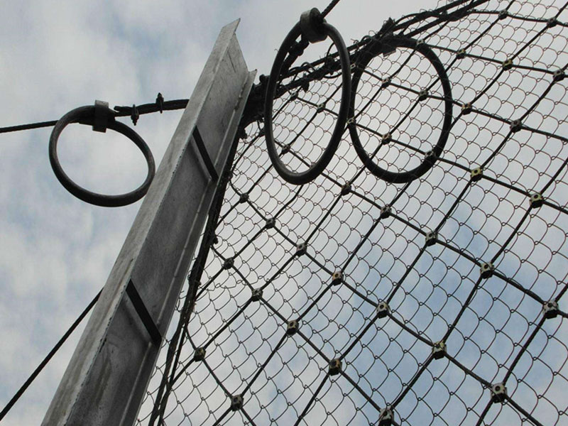 上半部分由特殊的被動防護(hù)網(wǎng)組成,鋼絲繩網(wǎng)和立柱是分離的。窗簾柔性防護(hù)網(wǎng)特點: