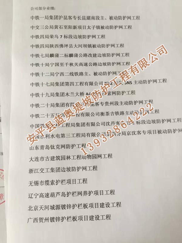 全部各地的客戶朋友們打進電話會咨詢一下邊坡防護網產品的問題,產品了解清楚后有的朋友會考察一下公司情況。這樣的客戶朋友我們是非常尊重的,了解供貨方公司實力這是最自己負責對工程負責。因此我們會提供我公司的相關資質、產品質量檢測報告、進場施工證明等。其實可以通過公司的工程業(yè)績(承接的工程項目)來證明公司實力。有些客戶會來我公司考察,為了客戶更方便的了解我們之前做過的一些項目,我們將最近3年施工過的邊坡防護網工程業(yè)績做了一下統(tǒng)計,并打印出來。